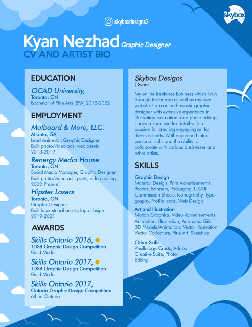 I started this freelance business on Instagram in 2020 but have had experience with professional graphic design work since 2016. I have built a large portfolio of work that represents my skills and have networked with dozens of clients while I was in school, studying graphic design and animation at OCAD. I have since graduated and am ready to share my skills with the world. I am happiest when I am creating, and I learn from everything I consume, whether I consider it to be appealing or unappealing, from an art and design perspective. I believe this makes me an asset to any design team.